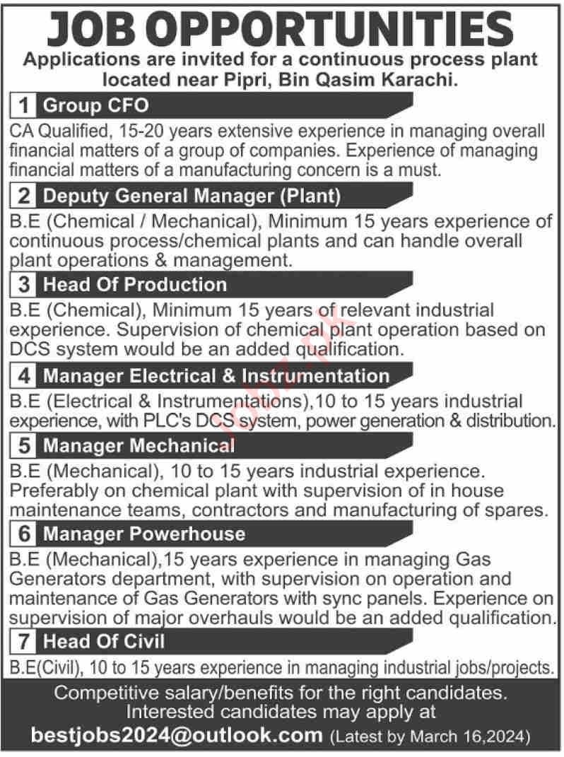 Private Company Karachi, karachi Sindh Pakistan invites applications from eligible candidates for the post of deputy general manager plant, manager electrical instrumentation, head of production, manager mechanical, group cfo, manager powerhouse and head of civil as per advertisement of March 10, 2024 published in daily Dawn Newspaper. Preferred Education is B.E and CA etc.
