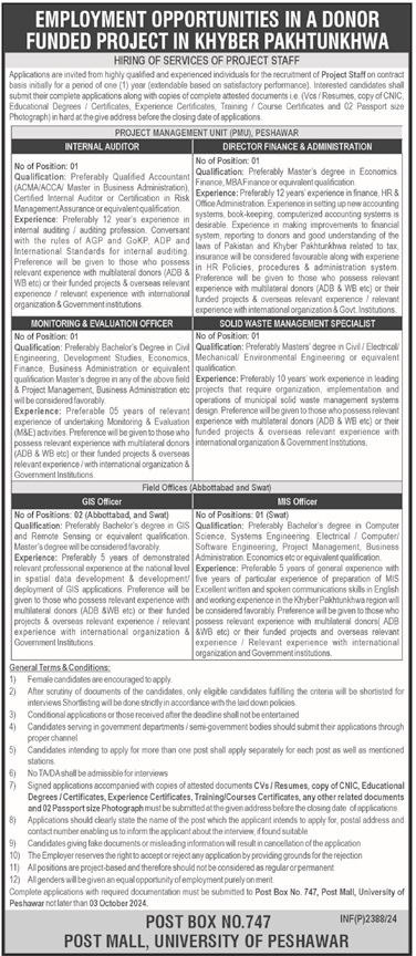 Project Management Unit PMU invites applications for job positions advertised in daily Mashriq dated 13 September 2024 for following vacancies in Peshawar, peshawar Khyber Pakhtunkhwa KPK Pakistan.