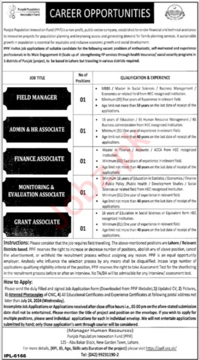 Punjab Population Innovation Fund PPIF is looking for candidates for following posts as per job advertisement published in daily Jang Newspaper of July 2, 2024 for location Lahore, lahore Punjab Pakistan: