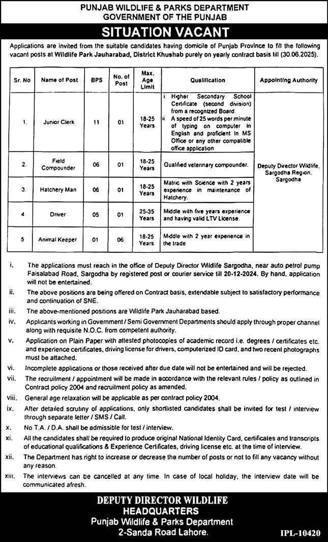 Punjab Wildlife & Parks Department invites applications for job positions advertised in daily Express dated 6 December 2024 for following vacancies in Lahore, lahore Punjab Pakistan.