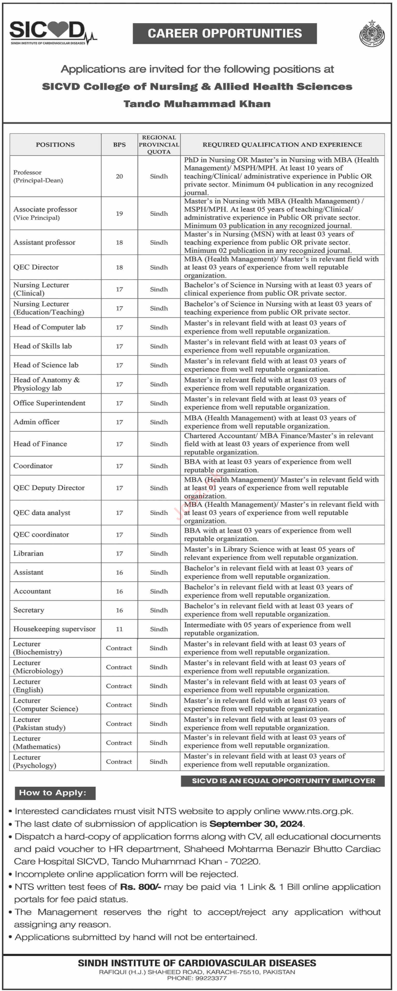 Sindh Institute of Cardiovascular Diseases jobs advertisement dated about 15 September 2024 in daily Dawn Newspaper invites application for the vacant post of assistant professor, head of science lab, associate professor, professor, secretary, assistant, lecturer computer science, qec coordinator, lecturer psychology, qec data analyst, librarian, nursing lecturer education, lecturer biochemistry, housekeeping supervisor, head of anatomy physiology lab, dean, head of computer lab, nursing lecturer teaching, admin officer, lecturer english, vice principal, qec director, lecturer mathematics, coordinator, lecturer pakistan study, lecturer microbiology, nursing lecturer clinical, office superintendent, principal, head of skills lab, qec deputy director, head of finance and accountant in Tando Muhammad Khan, tando muhammad khan Sindh Pakistan. Educational qualifications required Master, Intermediate, Bachelor, Phd, BBA and MBA etc.