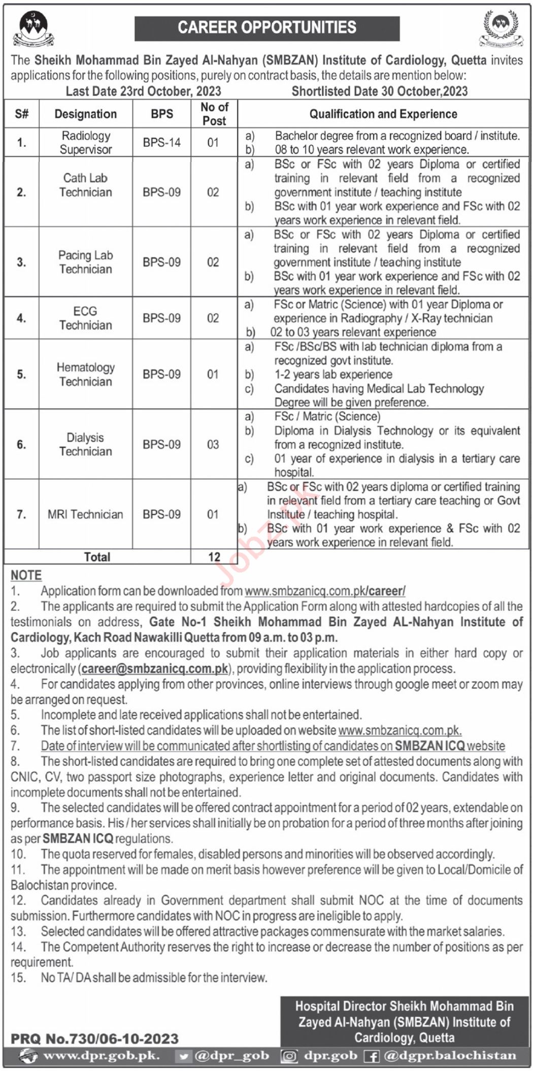 Sheikh Mohammad Bin Zayed Al Nahyan SMBZAN Institute of Cardiology jobs advertisement dated about 8 October 2023 in daily Express Tribune Newspaper invites application for the vacant post of mri technician, hematology technician, ecg technician, cath lab technician, pacing lab technician, radiology supervisor and dialysis technician in Quetta, quetta Balochistan Pakistan. Educational qualifications required Intermediate, Bachelor and Others etc.