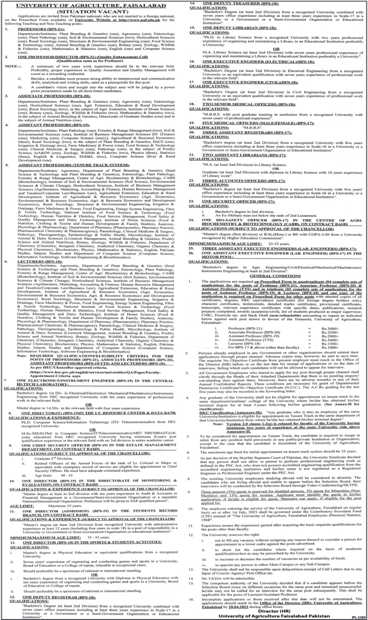 Vacant posts including assistant librarian, director, deputy treasurer, executive engineer civil, bio safety officer, chief security officer, director quality ehancement cell, director it, instrument engineer, medical officer, associate professor, assistant executive engineer, assistant professor, deputy registrar, accounts officer, deputy librarian, director admission, executive engineer electrical, assistant registrar, lecturer, security officer, director sports students activities, lab engineer, electronics engineer and professor are announced in University of Agriculture UAF Faisalabad, faisalabad Punjab Pakistan as per 7 April 2023 advertisement in daily Jang Newspaper. Master, Phd, MA, MBBS, B.E, Bachelor, Mphil and MS etc. educational qualification will be preferred.