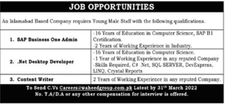 Waheed Group invites applications for job positions advertised in daily Jang dated 20 March 2022 for following vacancies in Islamabad, islamabad Islamabad Pakistan.