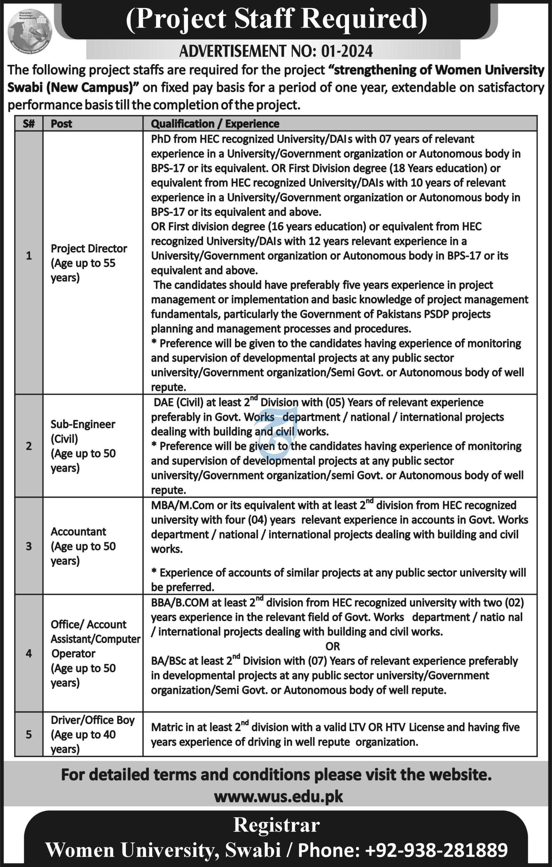 Women University is looking for candidates for following posts as per job advertisement published in daily Aaj Newspaper of July 26, 2024 for location Swabi, swabi Khyber Pakhtunkhwa KPK Pakistan: