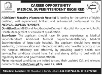 Apply at Al Khidmat Teaching Hospital latest Private jobs in Management and departments before closing date which is around June 15, 2024 or as per closing date in newspaper ad. Read complete ad online to know how to apply on latest Al Khidmat Teaching Hospital job opportunities.