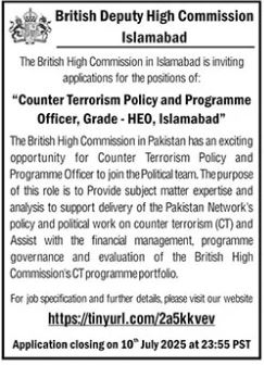 British Deputy High Commission is looking for candidates for following posts as per job advertisement published in daily The News Newspaper of June 29, 2025 for location Islamabad, islamabad Islamabad Pakistan: