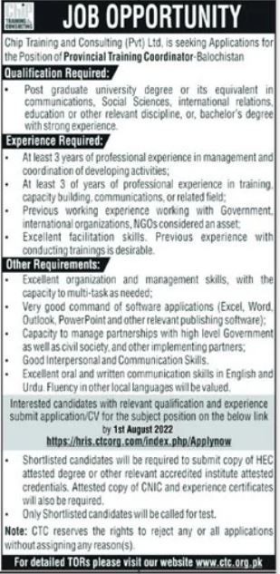 CHIP Training & Consulting Pvt Ltd invites applications for job positions advertised in daily Jang dated 25 July 2022 for following vacancies in Quetta, quetta Balochistan Pakistan.