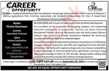 FF Steel Manufacturing Industry jobs advertisement dated about 1 September 2024 in daily The News Newspaper invites application for the vacant post of flutter developer in Peshawar, peshawar Khyber Pakhtunkhwa KPK Pakistan. Persons with BIT, BCS and B.E etc. education can apply.