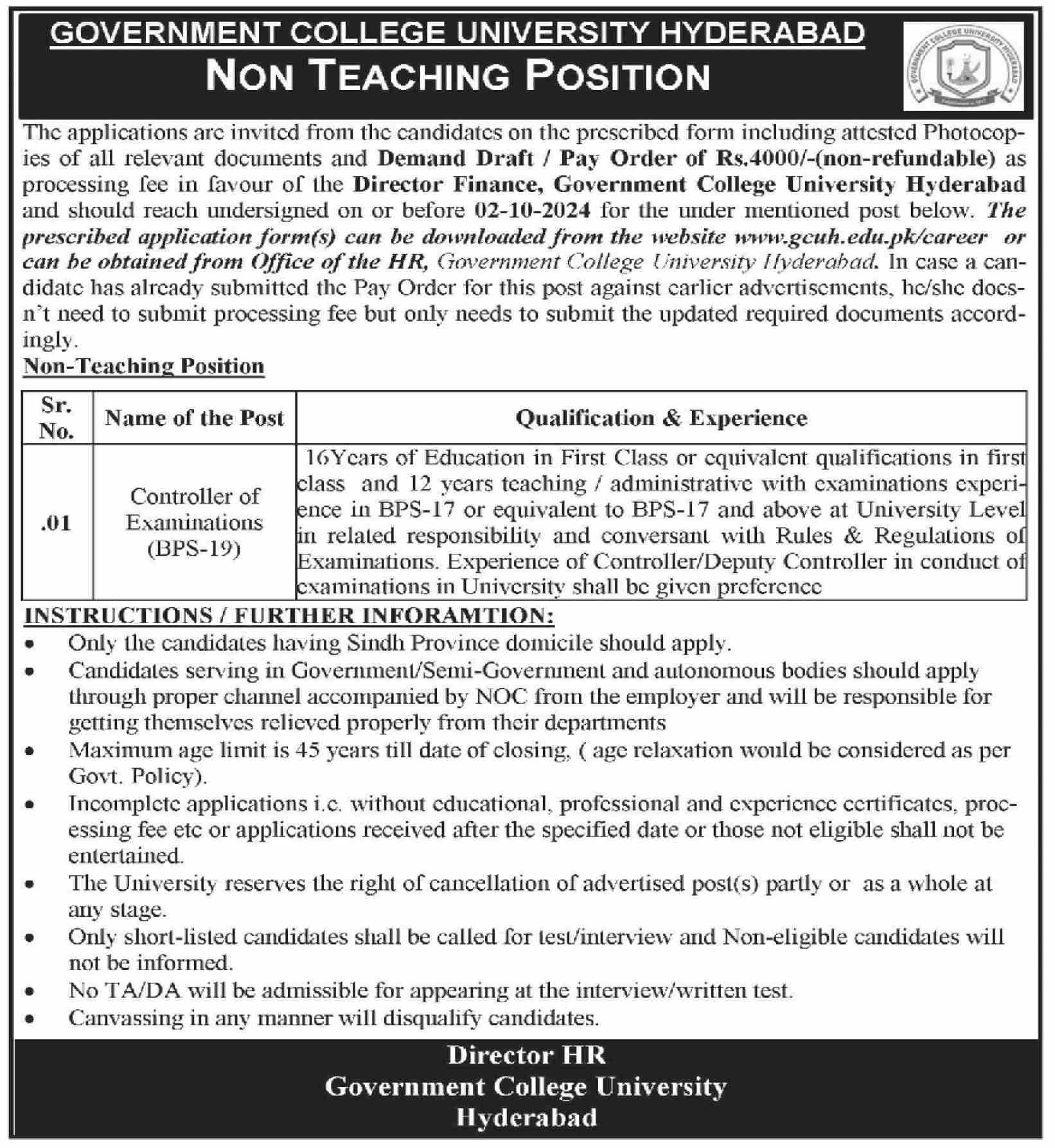 Government College University Hyderabad, hyderabad Sindh Pakistan invites applications from eligible candidates for the post of controller of examinations as per advertisement of September 20, 2024 published in daily Dawn Newspaper. Preferred Education is Master and Bachelor etc.