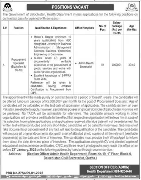 Health Department jobs advertisement dated about 10 January 2025 in daily Jang Newspaper invites application for the vacant post of procurement specialist in Quetta, quetta Balochistan Pakistan. Educational qualifications required Master etc.