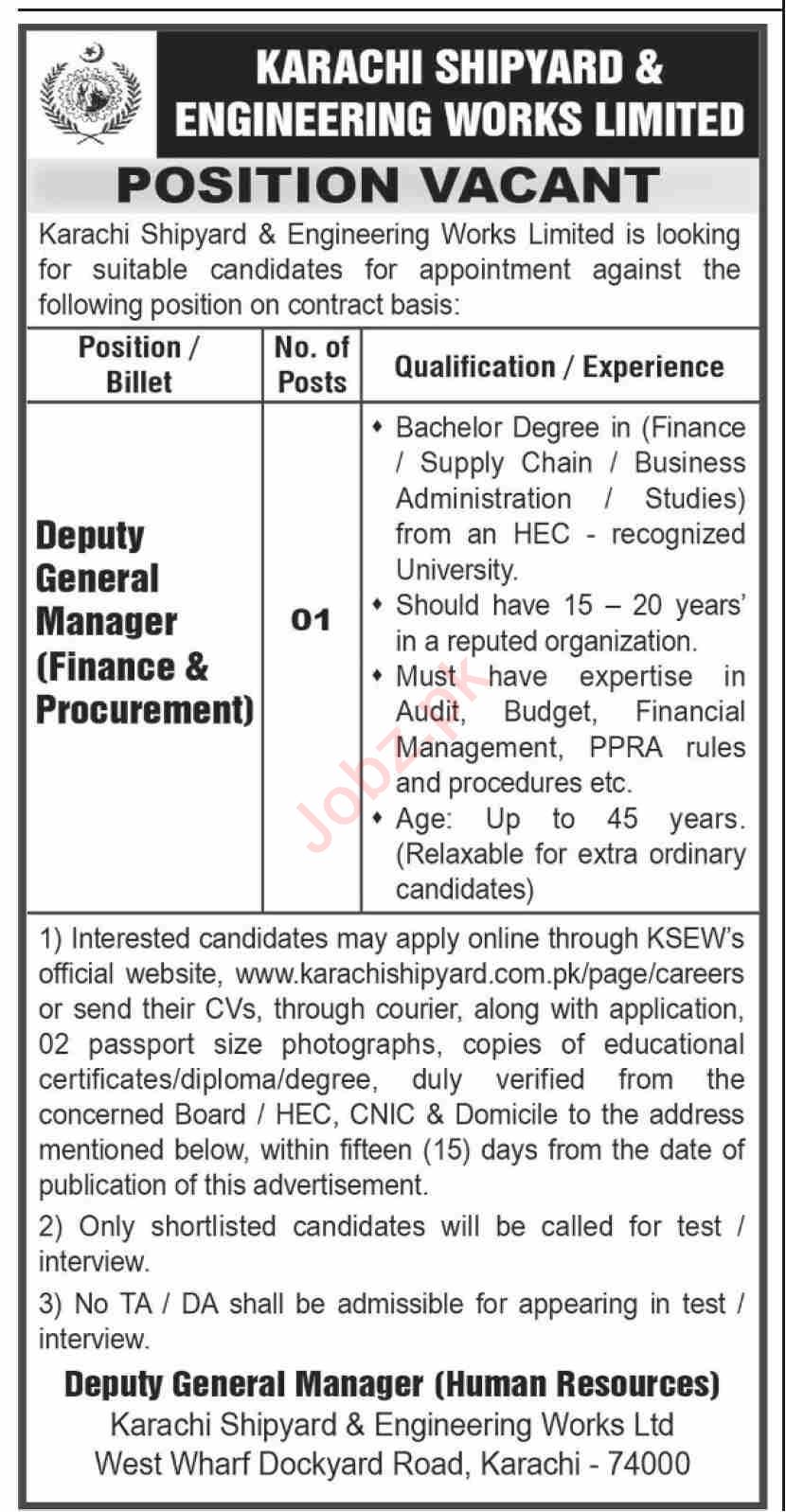Vacant posts including deputy general manager finance procurement are announced in Karachi Shipyard and Engineering Works Limited Karachi, karachi Sindh Pakistan as per 1 June 2025 advertisement in daily Dawn Newspaper. Preferred Education is Bachelor etc.