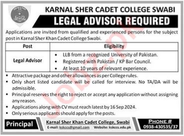 Karnal Sher Khan Cadet College Swabi Swabi, swabi Khyber Pakhtunkhwa KPK Pakistan invites applications from eligible candidates for the post of legal advisor as per advertisement of September 1, 2024 published in daily The News Newspaper. Educational qualifications required LLb etc.