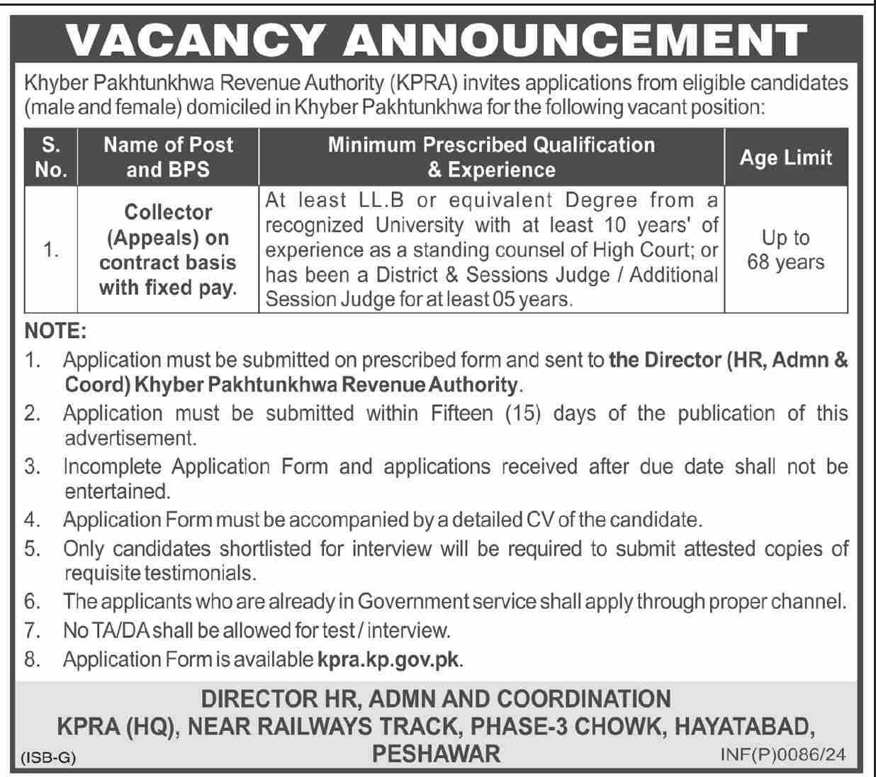 Khyber Pakhtunkhwa Revenue Authority KPRA is looking for candidates for following posts as per job advertisement published in daily Dawn Newspaper of January 16, 2024 for location Peshawar, peshawar Khyber Pakhtunkhwa KPK Pakistan: