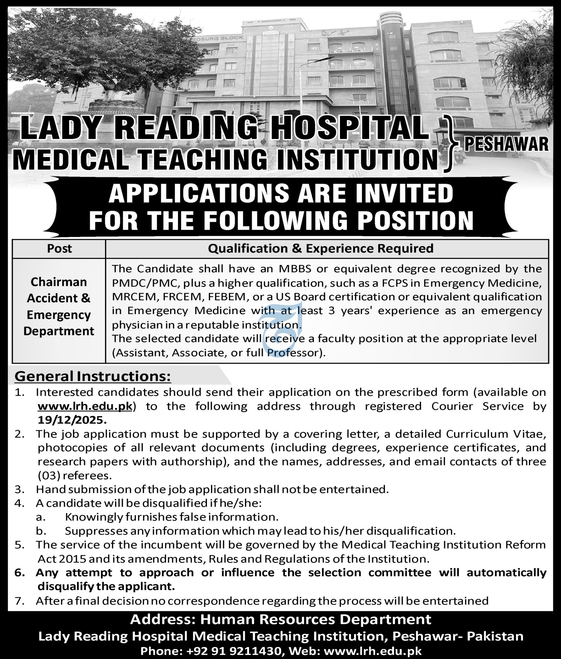 Vacant posts including chairman accident emergency department are announced in Lady Reading Hospital Peshawar, peshawar Khyber Pakhtunkhwa KPK Pakistan as per 6 December 2025 advertisement in daily Aaj Newspaper. Candidates with MBBS etc. educational background will be preferred.