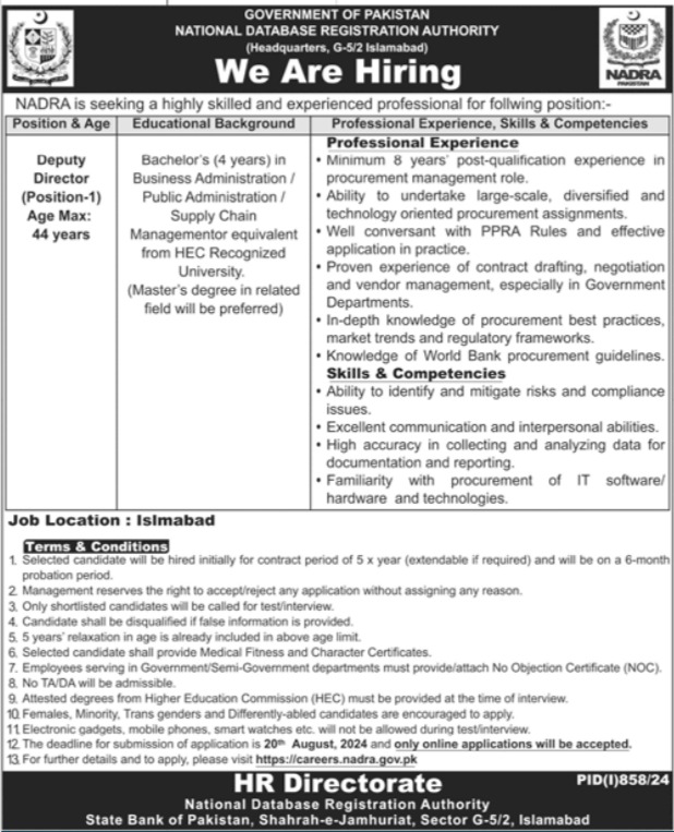 National Database & Registration Authority NADRA is looking for candidates for following posts as per job advertisement published in daily Jang Newspaper of August 7, 2024 for location Islamabad, islamabad Islamabad Pakistan: