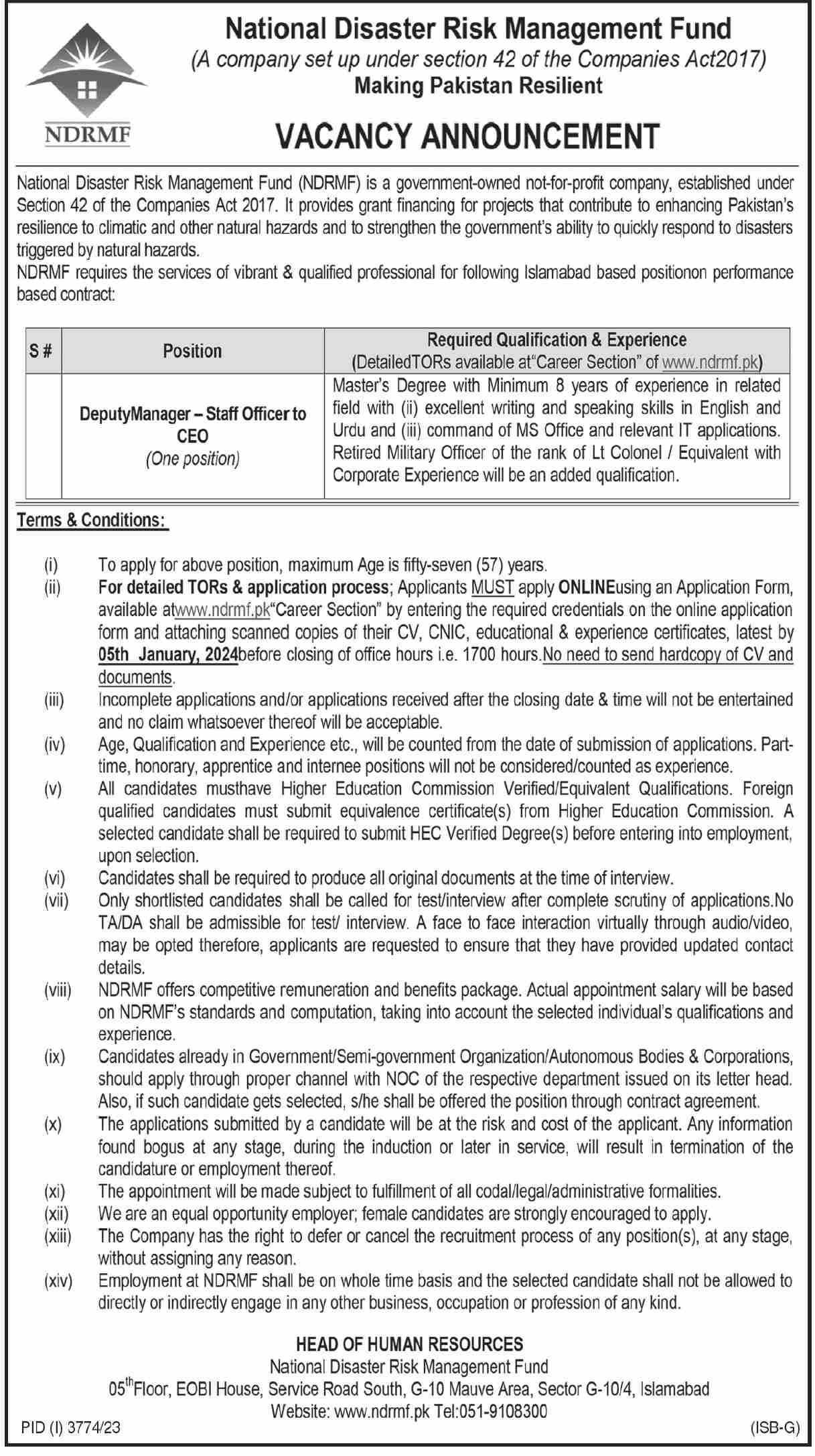 National Disaster Risk Management Fund NDRMF jobs advertisement dated about 22 December 2023 in daily Dawn Newspaper invites application for the vacant post of deputy manager and staff officer to ceo in Islamabad, islamabad Islamabad Pakistan. Persons with MS and Master etc. education can apply.