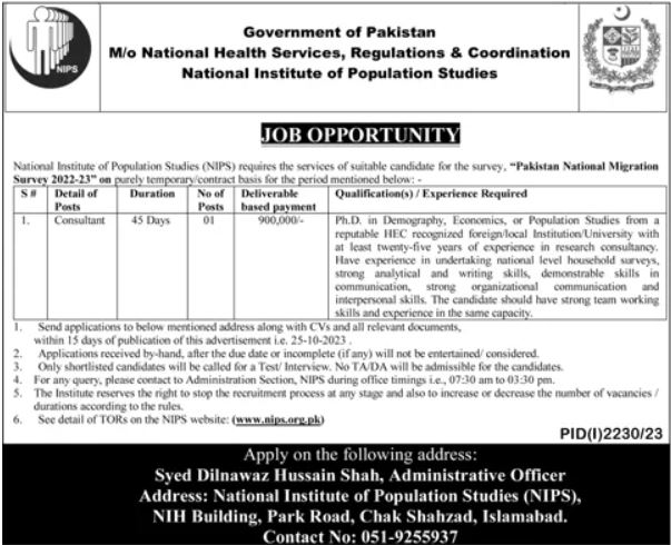 Vacancies in Ministry of National Health Services Regulations & Coordination NHSRC Advertisement October 2023