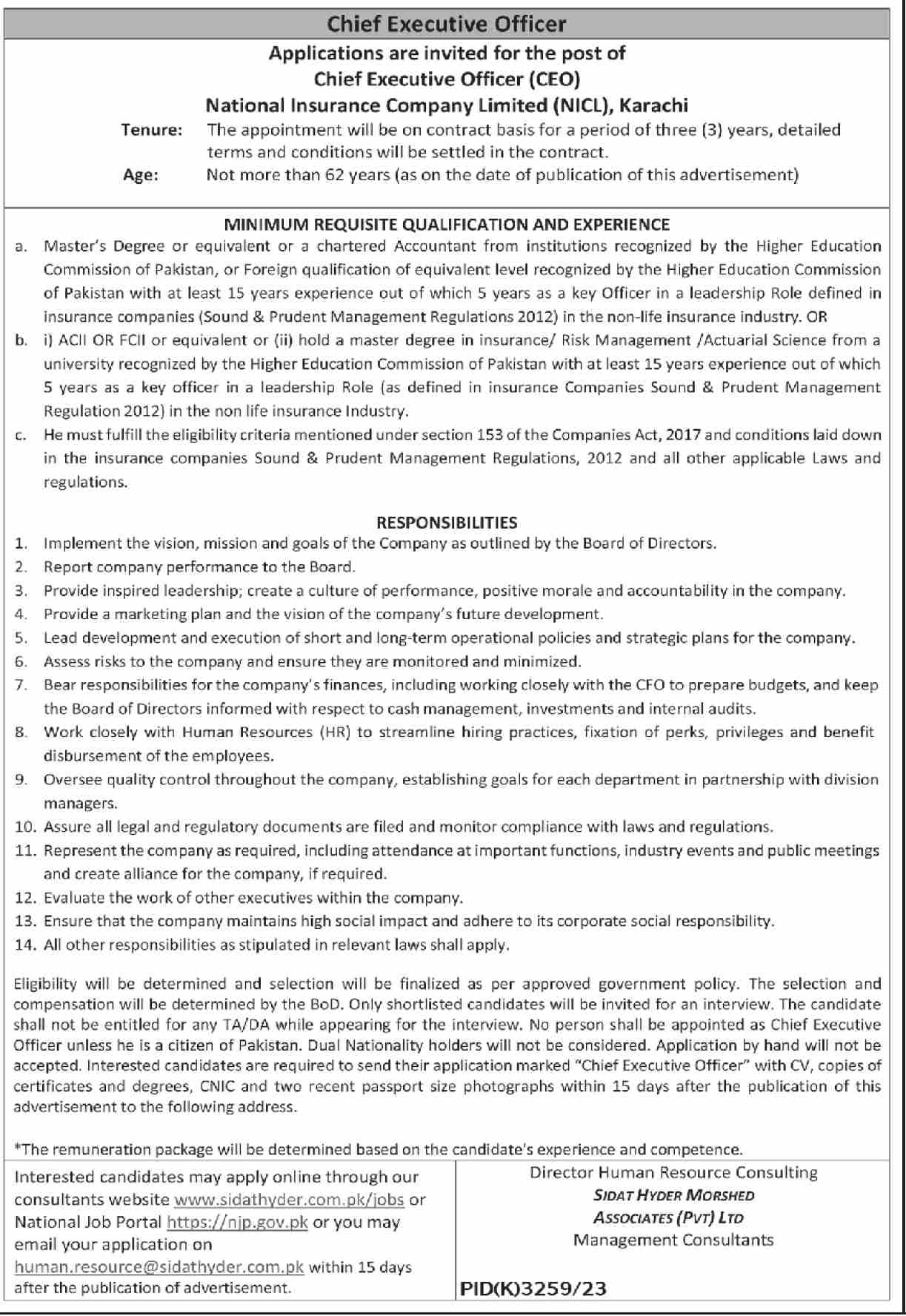 Latest National Insurance Company Limited NICL Management Posts Karachi 2025