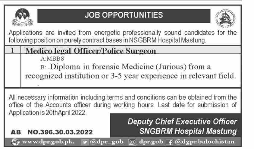 Nawab Ghaus Bakhsh Raisani NSGBRM Hospital invites applications for job positions advertised in daily Dawn dated 31 March 2022 for following vacancies in Mastung, mastung Balochistan Pakistan.