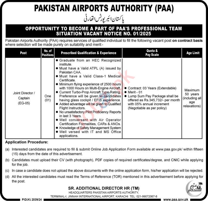 Pakistan Airports Authority PAA Karachi, karachi Sindh Pakistan invites applications from eligible candidates for the post of captain and joint director as per advertisement of January 5, 2025 published in daily Aaj Newspaper. Educational qualifications required Bachelor and Master etc.