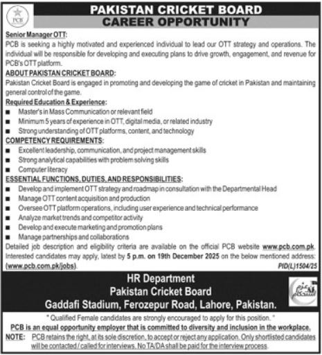 Latest Government jobs in Pakistan Cricket Board PCB in Management and others can be applied till 19 December 2025 or as per closing date in newspaper ad. Read complete ad online to know how to apply on latest Pakistan Cricket Board PCB job opportunities.