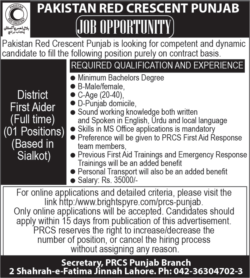 Pakistan Red Crescent PRC invites applications for job positions advertised in daily Nawaiwaqt dated 26 April 2022 for following vacancies in Sialkot, sialkot Punjab Pakistan.
