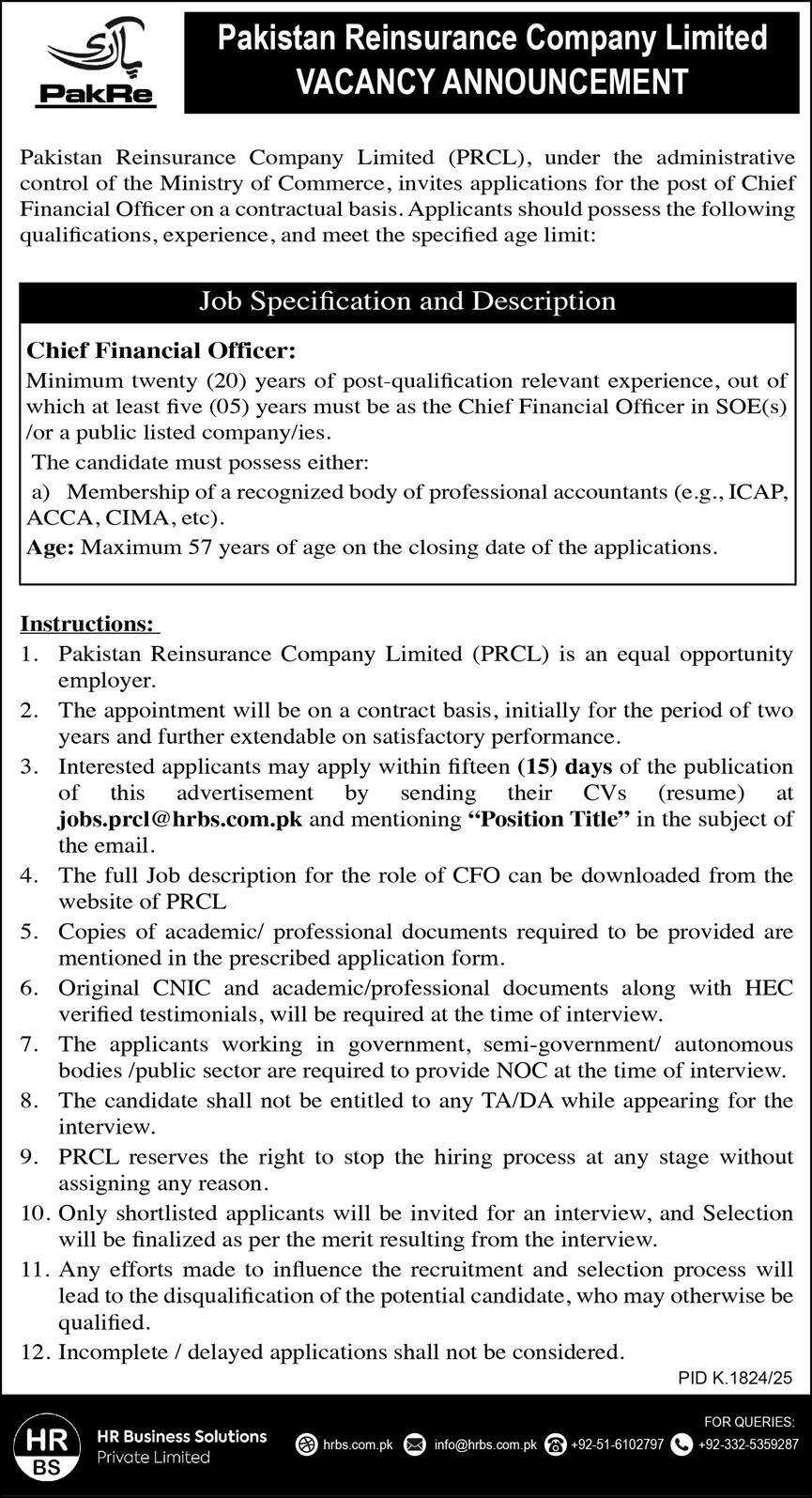 Pakistan Reinsurance Company Limited PRCL jobs advertisement dated about 23 November 2025 in daily Express Newspaper invites application for the vacant post of chief financial officer in Islamabad, islamabad Islamabad Pakistan. Preferred Education is ACCA etc.