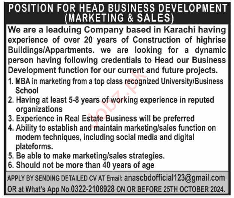 Private Company jobs advertisement dated about 20 October 2024 in daily Dawn Newspaper invites application for the vacant post of head business development in Karachi, karachi Sindh Pakistan. Preferred Education is Bachelor and Master etc.