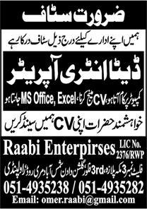 Raabi Enterprises Rawalpindi, rawalpindi Punjab Pakistan invites applications from eligible candidates for the post of data entry operator as per advertisement of October 26, 2024 published in daily Express Newspaper. Bachelor and Intermediate etc. educational qualification will be preferred.