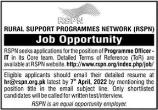 Rural Support Programmes Network RSPN latest Private IT jobs and others can be applied till 7 April 2022 or as per closing date in newspaper ad. Read complete ad online to know how to apply on latest Rural Support Programmes Network RSPN job opportunities.