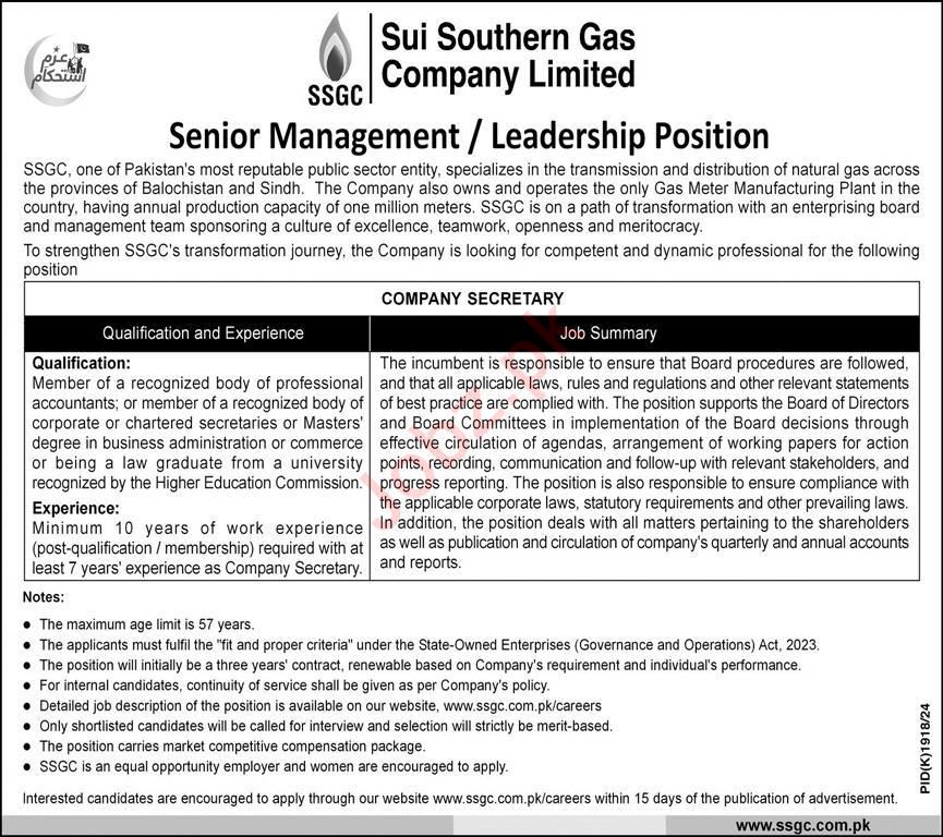 Latest Government jobs in Sui Southern Gas Company Limited SSGC in Secretarial and others can be applied till 6 January 2025 or as per closing date in newspaper ad. Read complete ad online to know how to apply on latest Sui Southern Gas Company Limited SSGC job opportunities.
