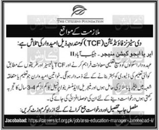 The Citizens Foundation TCF invites applications for job positions advertised in daily Kawish dated 8 July 2024 for following vacancies in Jacobabad, jacobabad Sindh Pakistan.