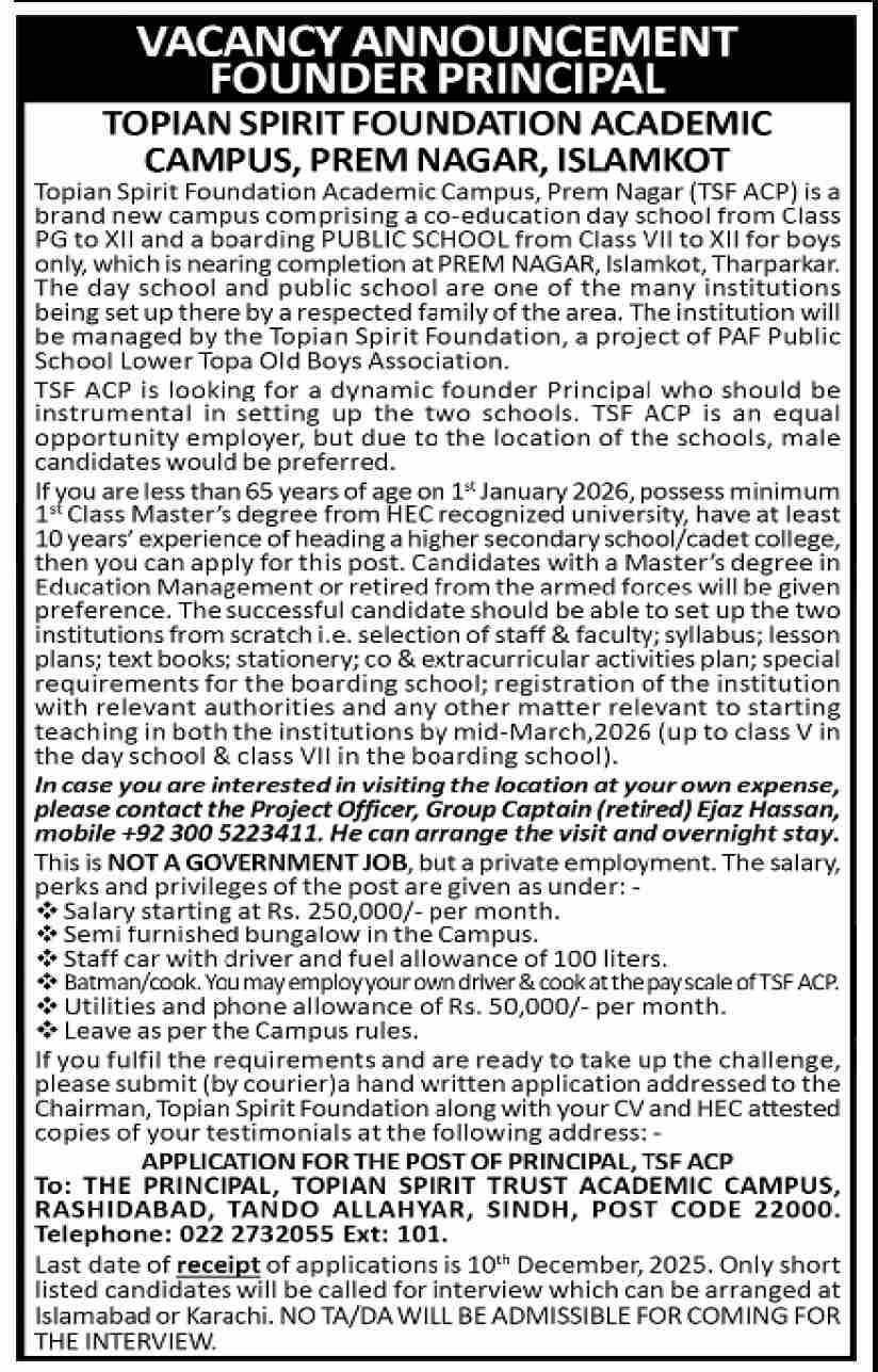 Topian Spirit Trust Academic Campus Tando Allahyar, tando allahyar Sindh Pakistan invites applications from eligible candidates for the post of principal as per advertisement of November 23, 2025 published in daily Dawn Newspaper. Persons with Master and Bachelor etc. education can apply.