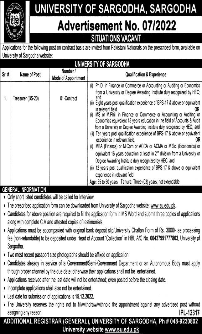 Vacant posts including treasurer are announced in University of Sargodha UOS Sargodha, sargodha Punjab Pakistan as per 25 November 2022 advertisement in daily Express Newspaper. Persons with Phd, MBA, MS, Mphil and ACCA etc. education can apply.