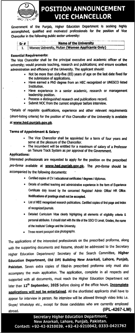 Higher Education Department Multan, multan Punjab Pakistan invites applications from eligible candidates for the post of vice chancellor as per advertisement of August 24, 2025 published in daily Nawaiwaqt Newspaper. Persons with Phd etc. education can apply.