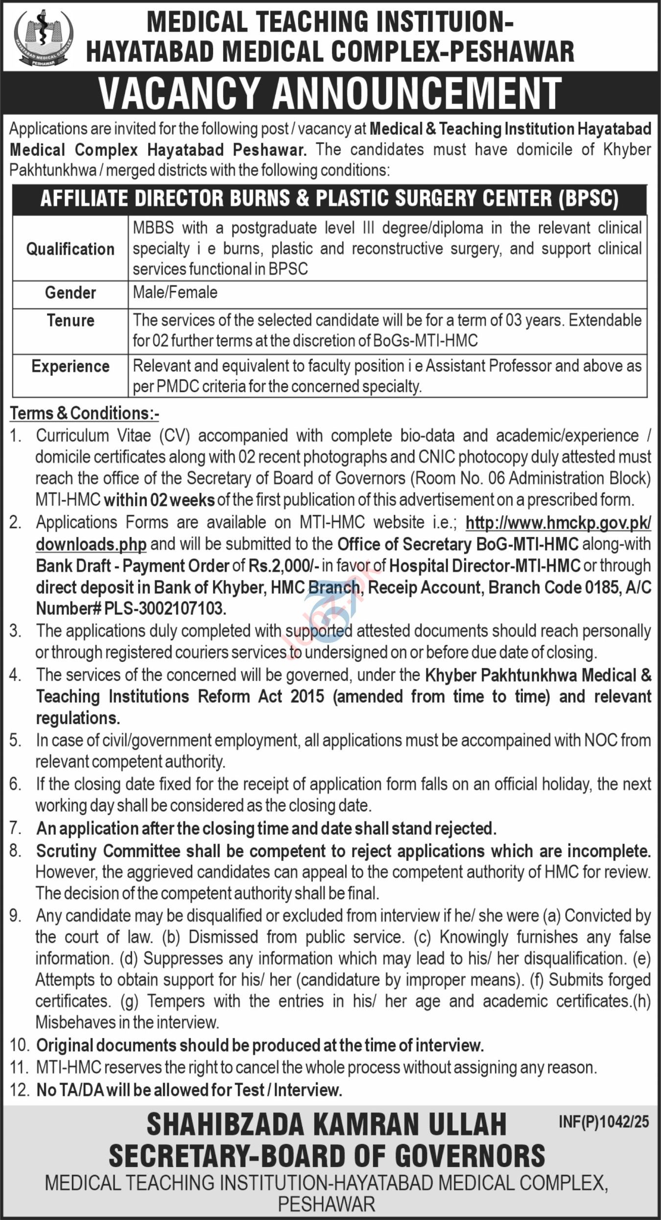 Vacant posts including affiliate director are announced in Medical Teaching Institution MTI Hayatabad Peshawar, peshawar Khyber Pakhtunkhwa KPK Pakistan as per 16 March 2025 advertisement in daily Aaj Newspaper. MBBS etc. educational qualification will be preferred.