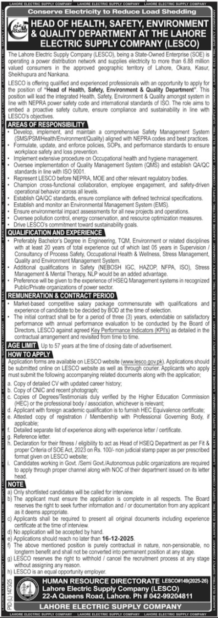 Lahore Electric Supply Company LESCO latest Government Management jobs and others can be applied till 16 December 2025 or as per closing date in newspaper ad. Read complete ad online to know how to apply on latest Lahore Electric Supply Company LESCO job opportunities.
