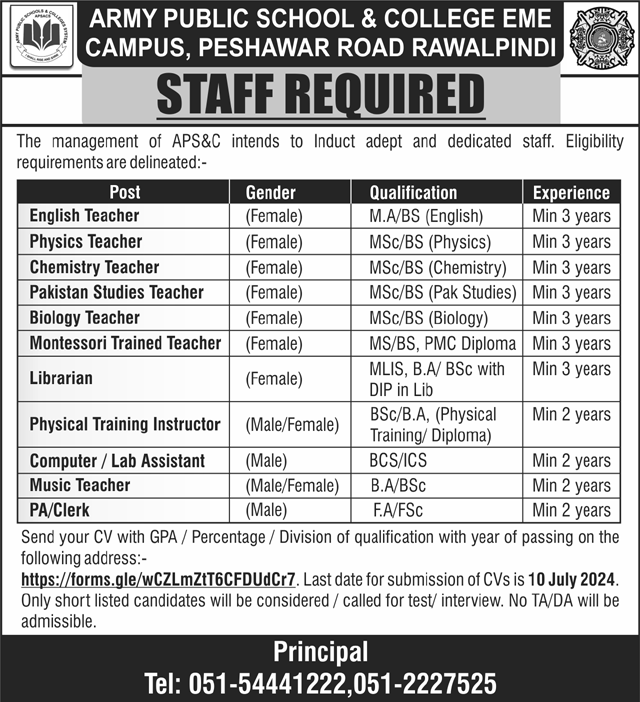Army Public School & College APS&C Rawalpindi, rawalpindi Punjab Pakistan invites applications from eligible candidates for the post of montessori trained teacher, lab assistant, biology teacher, physics teacher, english teacher, librarian, clerk, pa, chemistry teacher, music teacher, pakisatn studies teacher, computer assistant and physical training instructor as per advertisement of June 29, 2024 published in daily Nawaiwaqt Newspaper. Persons with BCS, M.sc, MS, BA and MA etc. education can apply.