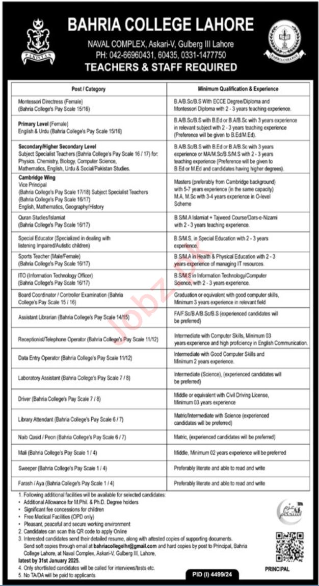 Bahria College Lahore, lahore Punjab Pakistan invites applications from eligible candidates for the post of vice principal, naib qasid, mali, mathematics teacher, biology teacher, information technology officer, library attendant, sweeper, board coordinator, islamiat teacher, sports teacher, telephone operator, special educator, quran studies teacher, social studies teacher, assistant librarian, computer science teacher, receptionist, data entry operator, laboratory assistant, english teacher, physics teacher, chemistry teacher, urdu teacher, driver, controller examination, farash, female montessori directress and aya as per advertisement of January 5, 2025 published in daily Ausaf Newspaper. Educational qualifications required Middle, Bachelor, Primary, Matric and Intermediate etc.