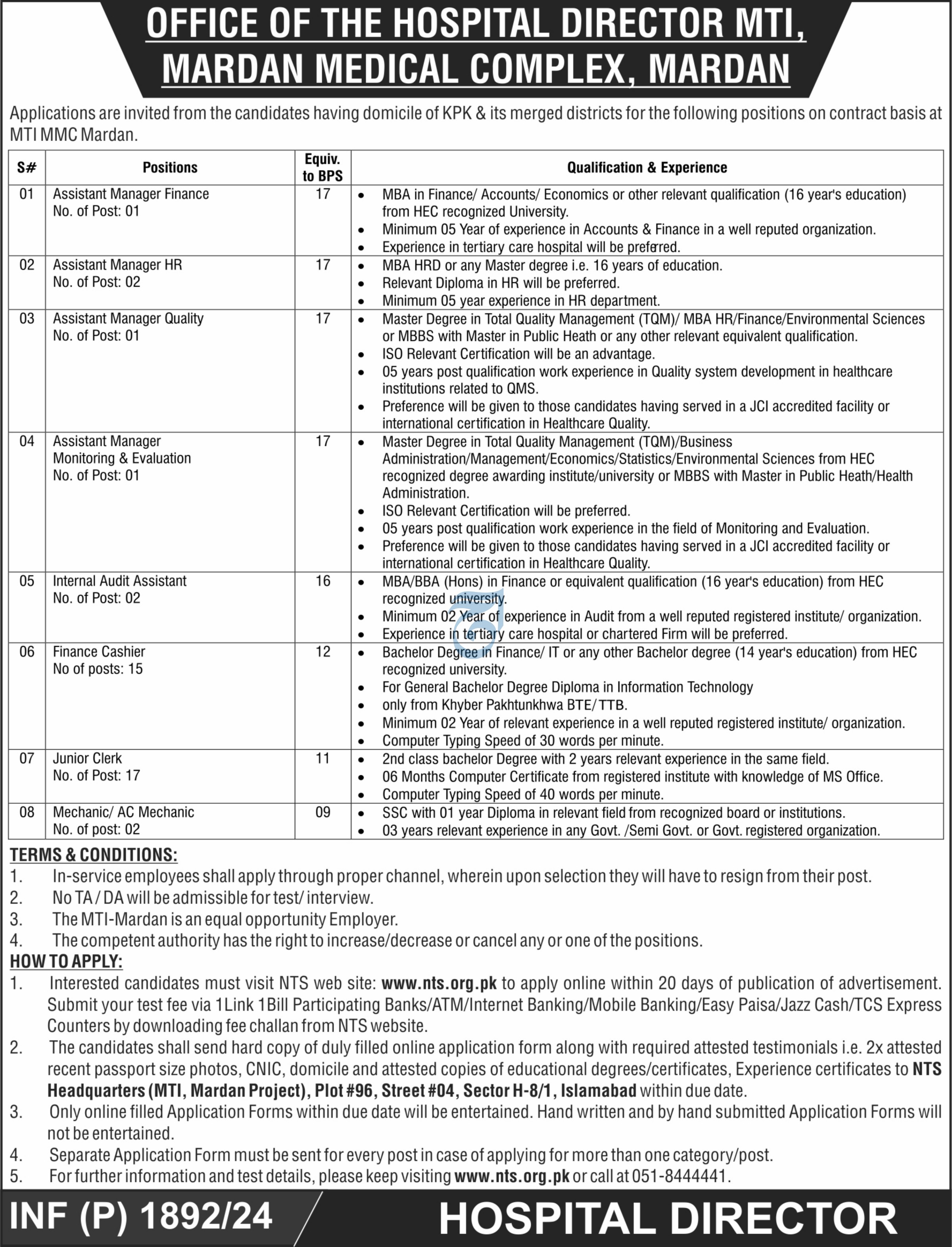 Vacant posts including ac mechanic, internal audit assistant, assistant manager finance, assistant manager hr, finance cashier, assistant manager monitoring evaluation, mechanic, clerk and assistant manager quality are announced in Medical Teaching Institution MTI Mardan, mardan Khyber Pakhtunkhwa KPK Pakistan as per 2 August 2024 advertisement in daily Aaj Newspaper. Persons with BBA, MBBS, DAE, Master and MBA etc. education can apply.