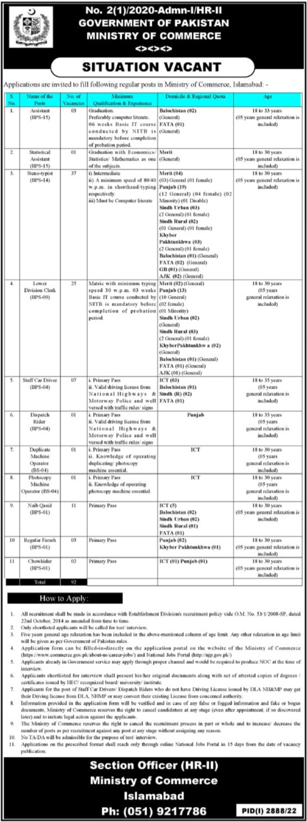 Vacancies in Ministry of Commerce Advertisement November 2022