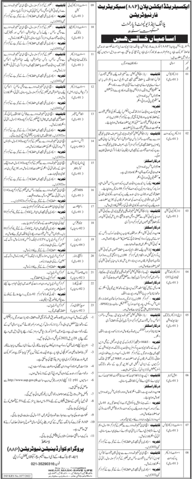 Planning and Development Department Karachi, karachi Sindh Pakistan invites applications from eligible candidates for the post of director information technology, assistant director monitoring evaluation, dispatch rider, assistant director finance, sanitary worker, office boy, driver, director procurement, assistant director field monitoring, deputy director monitoring evaluation, mas officer, clerk, director communication, office assistant, security guard, internal auditor, sweeper, director finance, accounts officer, nutrition coordinator, assistant director procurement, naib qasid, receptionist, assistant director grievance redressal and assistant director communication as per advertisement of April 15, 2022 published in daily Jang Newspaper. Preferred Education is MBA, Intermediate, BCS, Bachelor, MS, Primary, M.sc and Master etc.