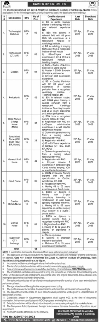 Sheikh Mohammad Bin Zayed Al Nahyan SMBZAN Institute of Cardiology jobs advertisement dated about 8 April 2023 in daily Jang Newspaper invites application for the vacant post of supervisor ot, general staff nurse, perfusionist, cardiac rehab nurse, dialysis nurse, technologist ct, technologist mri, cath lab technologist, specialist nurse, scrub nurse, head nurse and dietitian in Quetta, quetta Balochistan Pakistan. Master and Bachelor etc. educational qualification will be preferred.