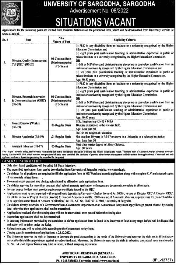 University of Sargodha UOS Sargodha, sargodha Punjab Pakistan invites applications from eligible candidates for the post of director academics, director research innovation commercialization, assistant librarian, project director works and director quality enhancement cell as per advertisement of December 8, 2022 published in daily Nation Newspaper. Preferred Education is Mphil, Phd, MS, B.E and Master etc.