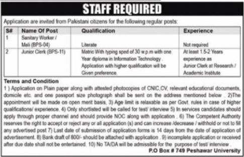 Government Organization invites applications for job positions advertised in daily Nawaiwaqt dated 27 August 2022 for following vacancies in Peshawar, peshawar Khyber Pakhtunkhwa KPK Pakistan.