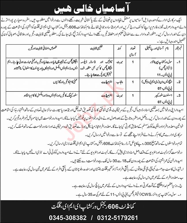 606 Regional Workshop EME Gilgit, gilgit Gilgit Baltistan Pakistan invites applications from eligible candidates for the post of hs one, assistant store keeper and civil workshop supervisor as per advertisement of April 20, 2025 published in daily Nawaiwaqt Newspaper. Candidates with Intermediate, Matric and DAE etc. educational background will be preferred.