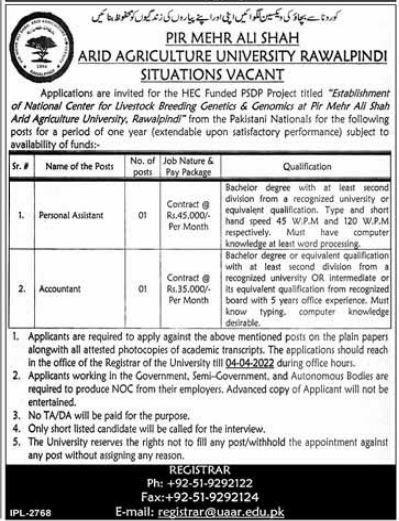 Vacant posts including personal assistant and accountant are announced in Pir Mehr Ali Shah Arid Agriculture University UAAR Rawalpindi, rawalpindi Punjab Pakistan as per 15 March 2022 advertisement in daily Express Newspaper. Intermediate and Bachelor etc. educational qualification will be preferred.