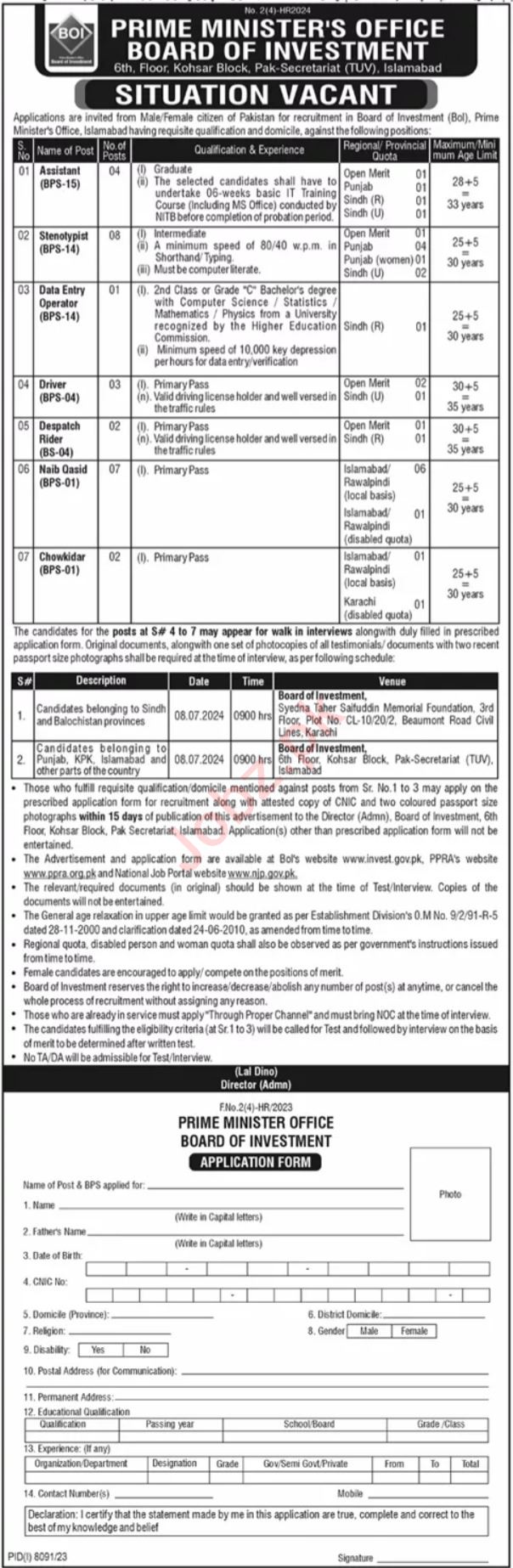 Board of Investment Islamabad, islamabad Islamabad Pakistan invites applications from eligible candidates for the post of assistant, dispatch rider, data entry operator, chowkidar, stenotypist, driver and naib qasid as per advertisement of July 1, 2024 published in daily Dunya Newspaper. Educational qualifications required Intermediate, Primary and Bachelor etc.