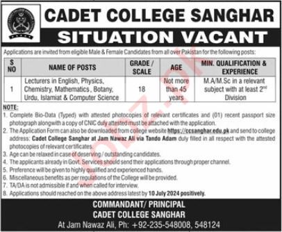 Cadet College jobs advertisement dated about 23 June 2024 in daily Jang Newspaper invites application for the vacant post of lecturer botany, lecturer islamiat, lecturer computer science, lecturer mathematics, lecturer urdu, lecturer chemistry, lecturer, lecturer english and lecturer physics in Sanghar, sanghar Sindh Pakistan. Preferred Education is MA and M.sc etc.